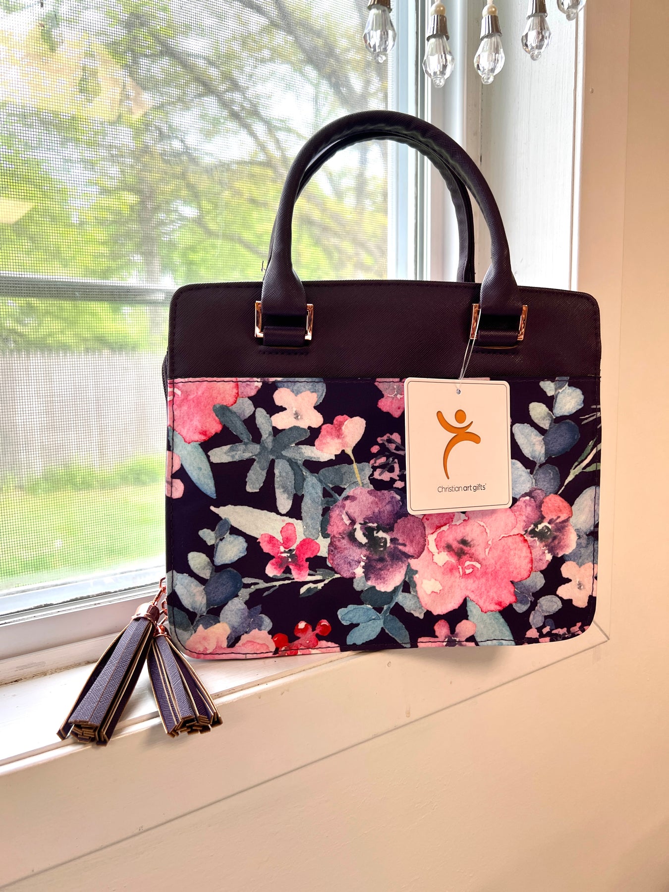 Lleve su Biblia en este elegante Forro de Biblia estilo Cartera (Bolso) con letras decorativas en el centro que dice en inglés "Blessed" que significa "Bendecida". Ideal para llevar su cuaderno de notas junto con su Biblia.