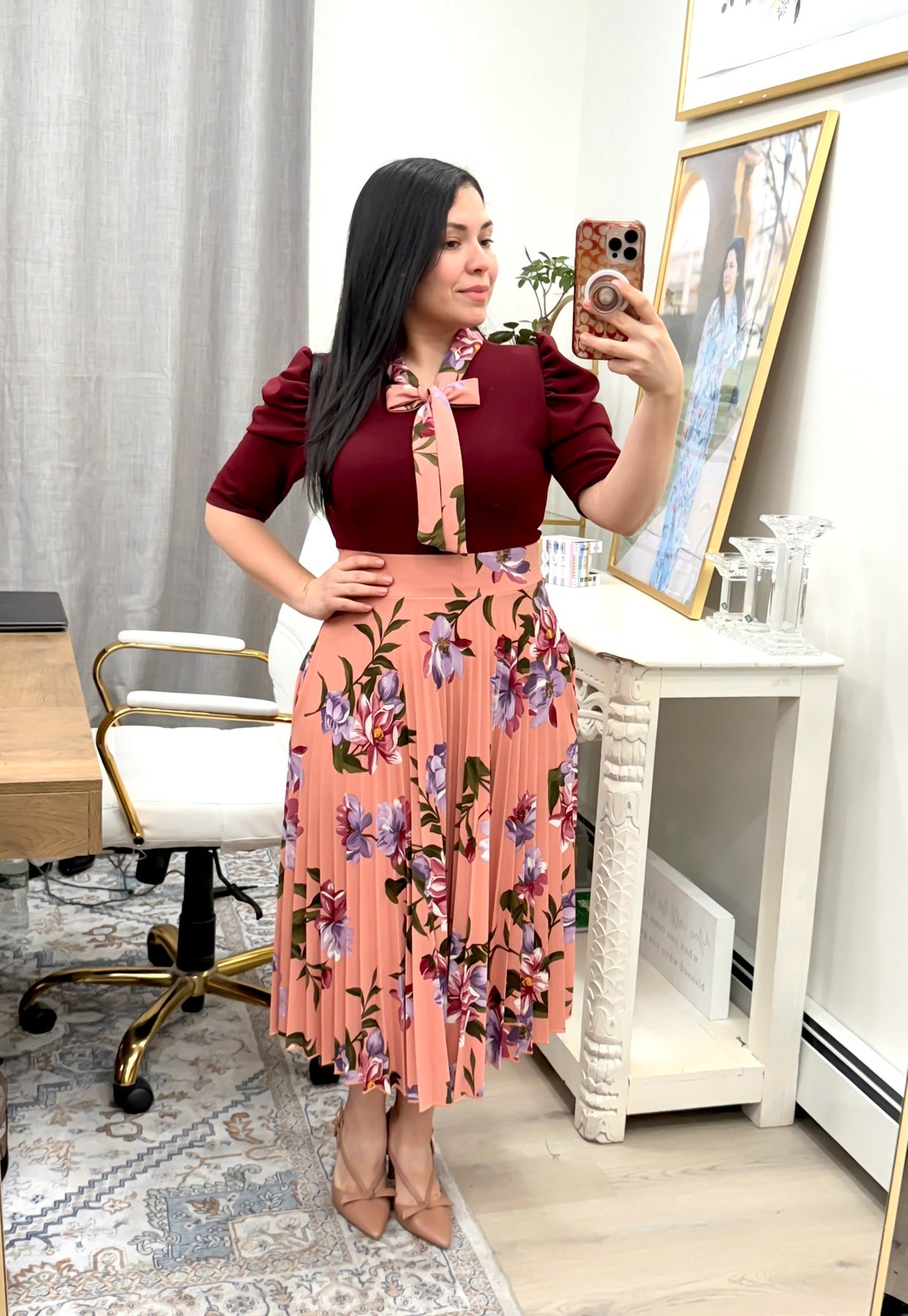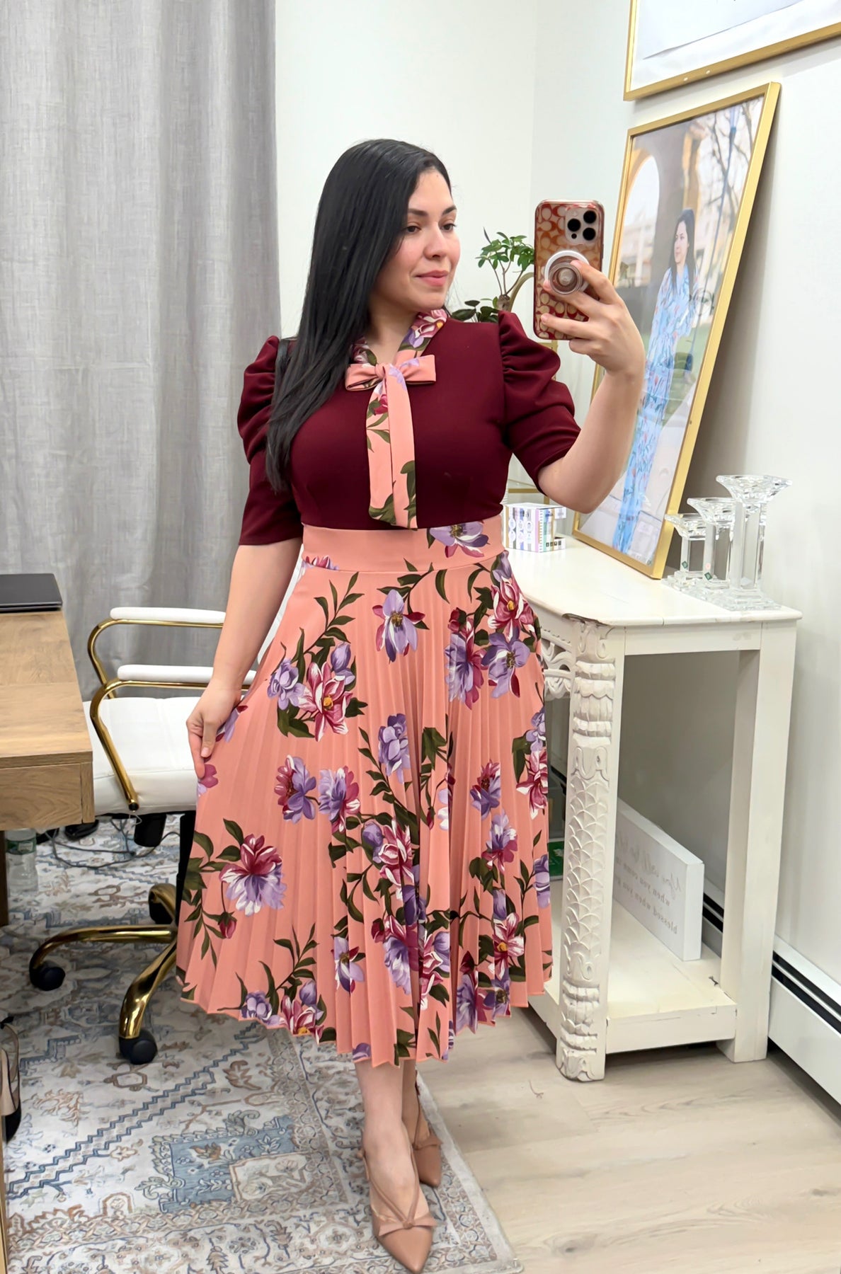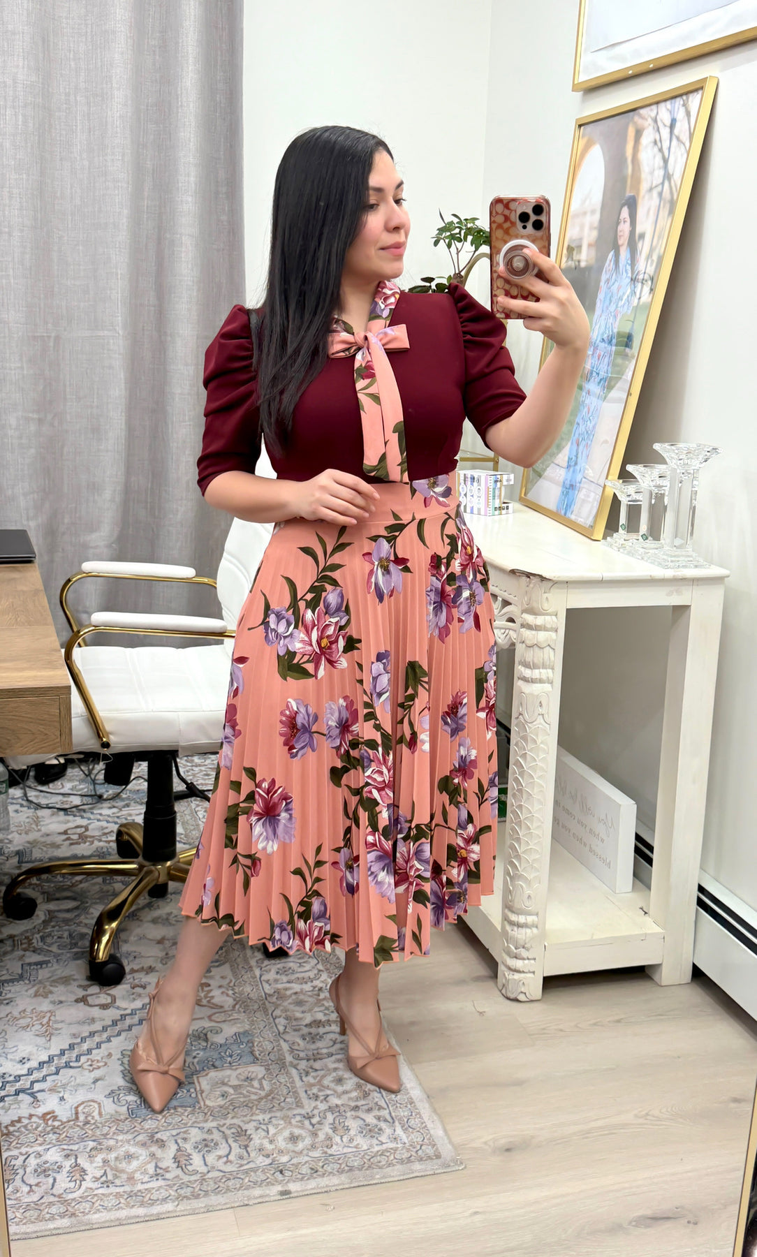 Lony Burgundy Pleated Midi Dress